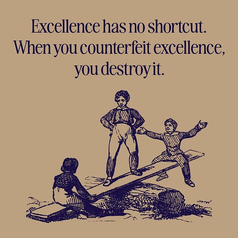 The truth is that excellence has no shortcut. When people mass-produce artificial diamonds, they turn out to be pebbles that nobody values. The attempt to counterfeit excellence only cheapens it. If you make the difficult and the extraordinary dumbed down or commonplace, you destroy it.
